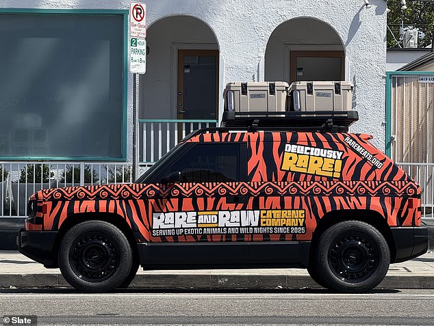 Other people spotted it parked in Los Angeles with fake business stickers—one being a make-believe ‘Rare and Raw Catering Company’—that included rooftop coolers allegedly marked for puma and goblin shark meats.
