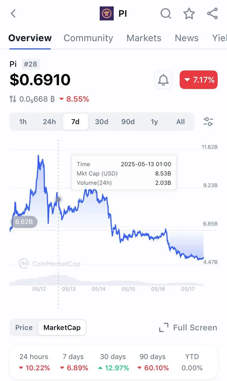The PI token has dropped over 50% in just one week as users await the mainnet launch.